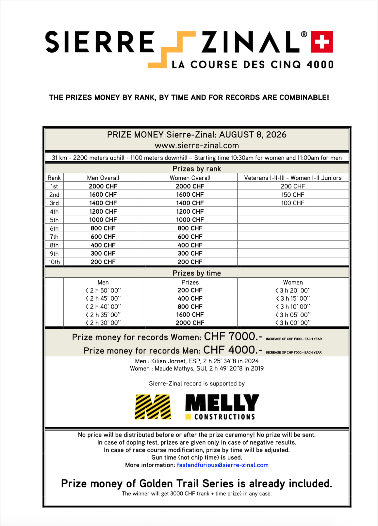 For the Veterans I to III categories, Women I to II categories, and for the Chandolin-Zinal Junior Race, rank-based prizes shall be awarded to the fastest participants within their respective categories.