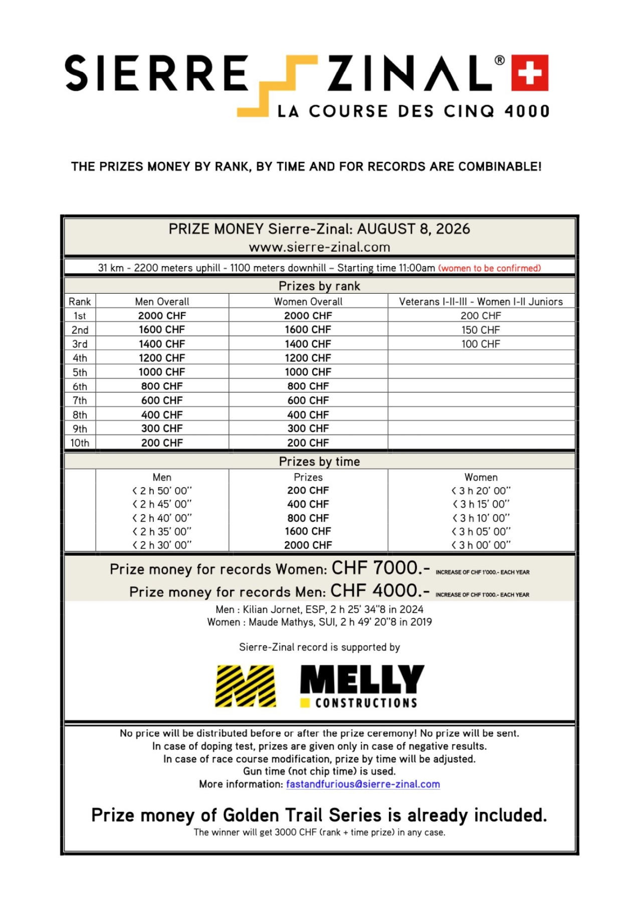 In the event of a new course record on the official adult course of the Sierre-Zinal Race, the record bonus shall initially amount to CHF 2,000.–.