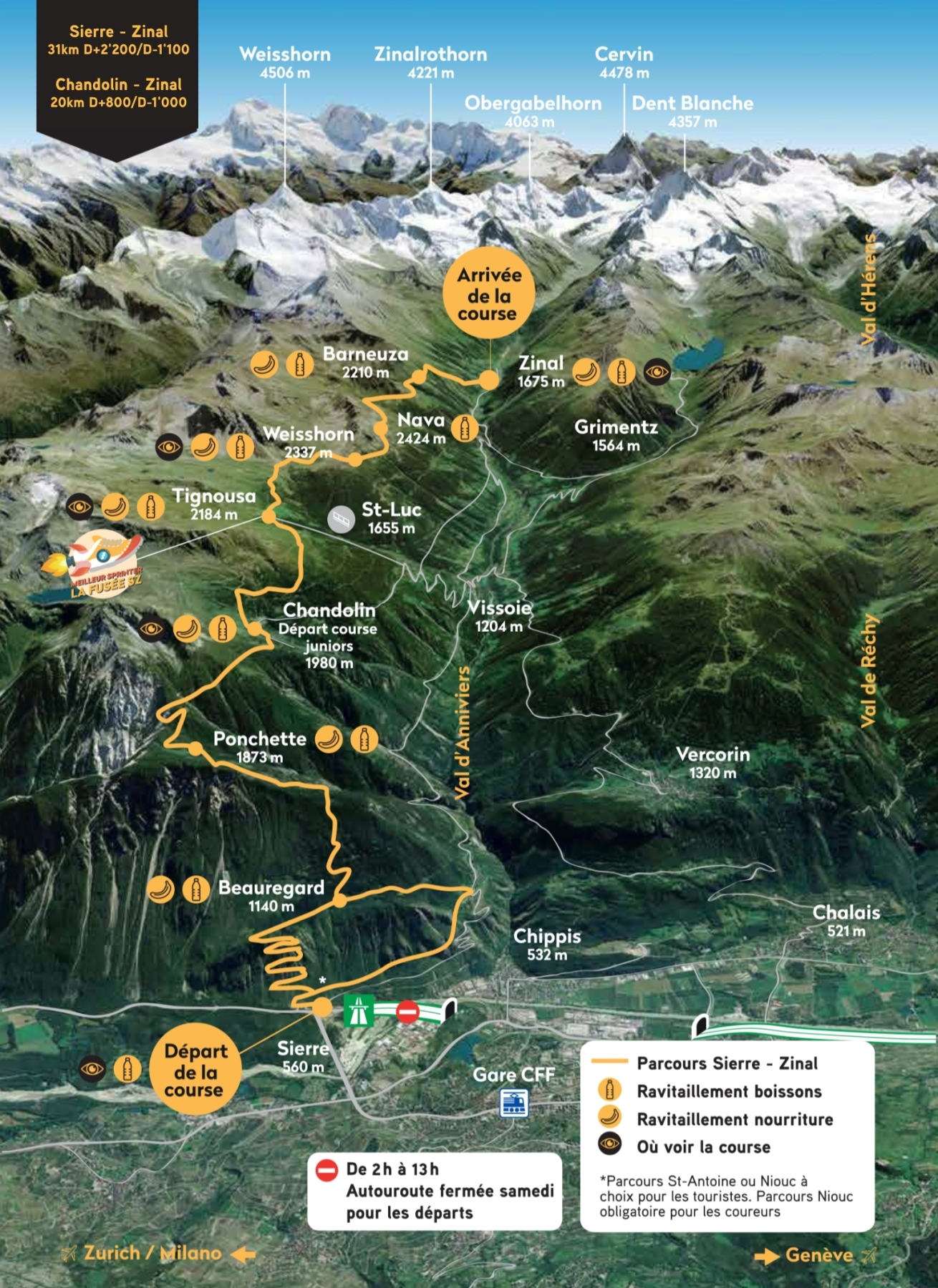 Visualisez le tracé complet de Sierre à Zinal, les points clés et les zones de ravitaillement